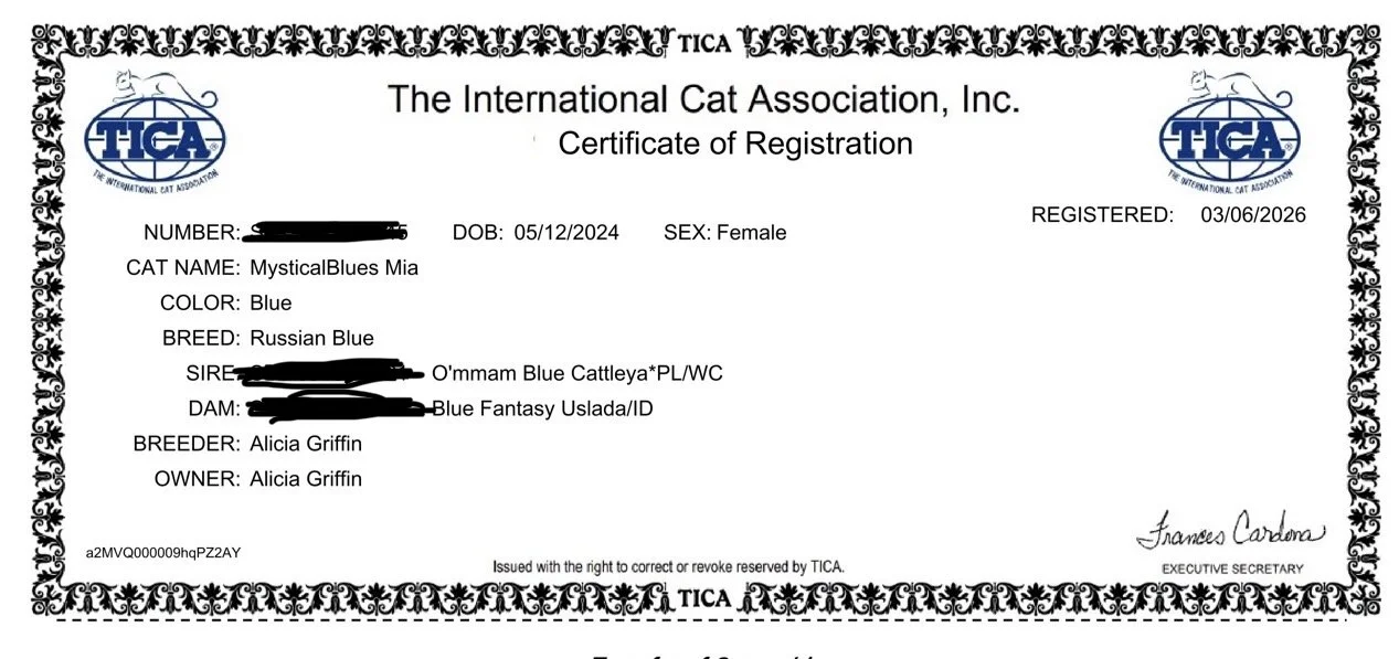 Mia is out of Cinder x Winston. She has a good mix of both parents, with Winston’s dominate eye shape and emerald green eyes pulling through in her features, to having her moms petite body structure. She definitely took on Winston's very needy personality for affection. Mia will come every evening and crawl up on you kneading your chest wanting to be pet all night. She absolutely loves affection and will reach her paw out to you when you walk by for pets or she will meow at you to give her attention. She is a big sweetheart that really wants human attention. Mia is also playful and will chase Mira around the house and pounce on each other.