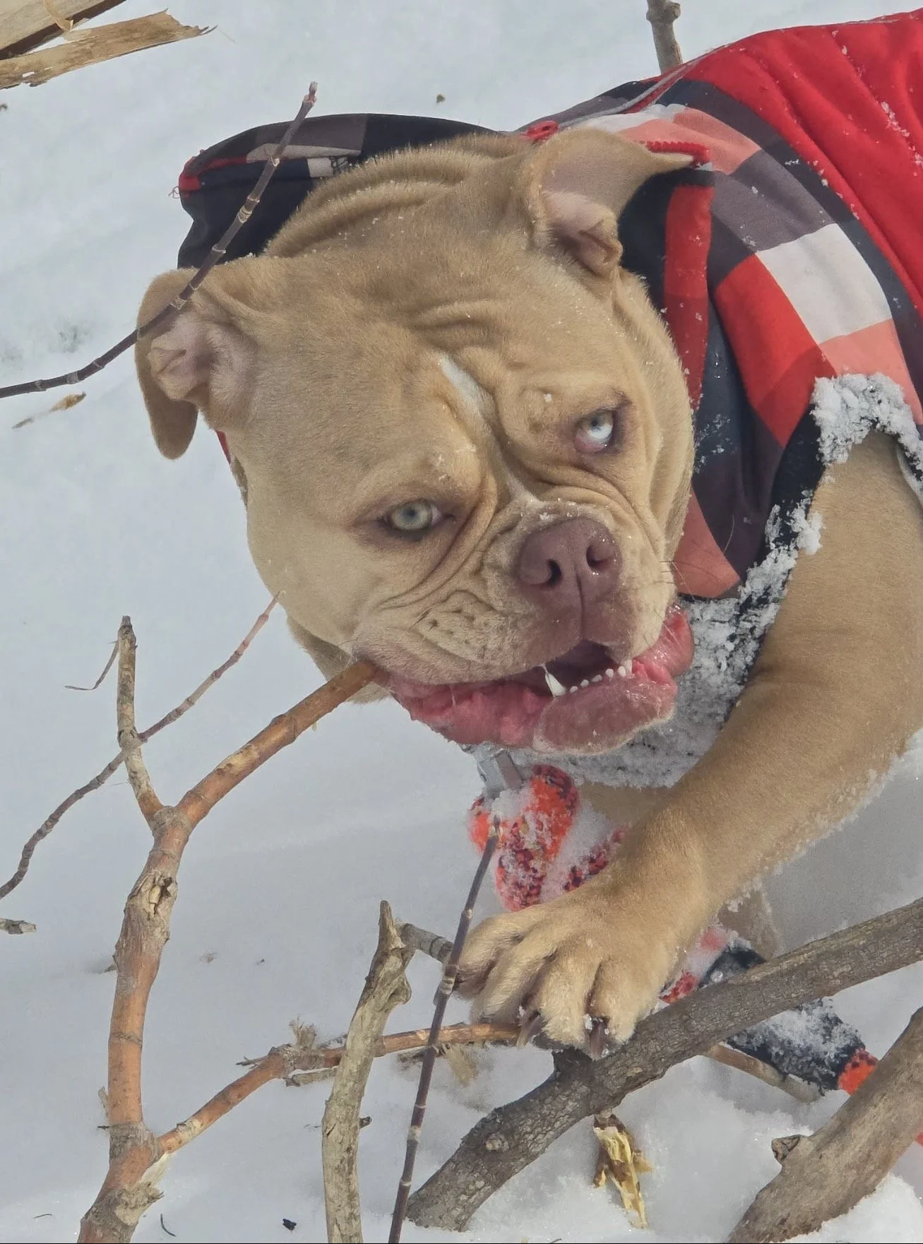 Brock is a handsome 11 month old chocolate merle tri male from their litter! He’s got a partial blue eye.